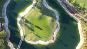 The stunning island green 11th hole at Tiger’s Eye Golf Links is a real beauty to behold! The smallish green complex is almost completely surrounded by water, with a wall of ancient coquina boulders (which are full of fossils, including mastodon teeth) serving as a bulkhead around the green. Wind is always a factor when you select your club on this hole, as there is absolutely no margin for error on three sides of this undulating green. A small bunker complex on the front right might be your salvation for any tee shot that doesn’t quite have enough. (Photo courtesy Tiger’s Eye Golf Club Facebook Page)