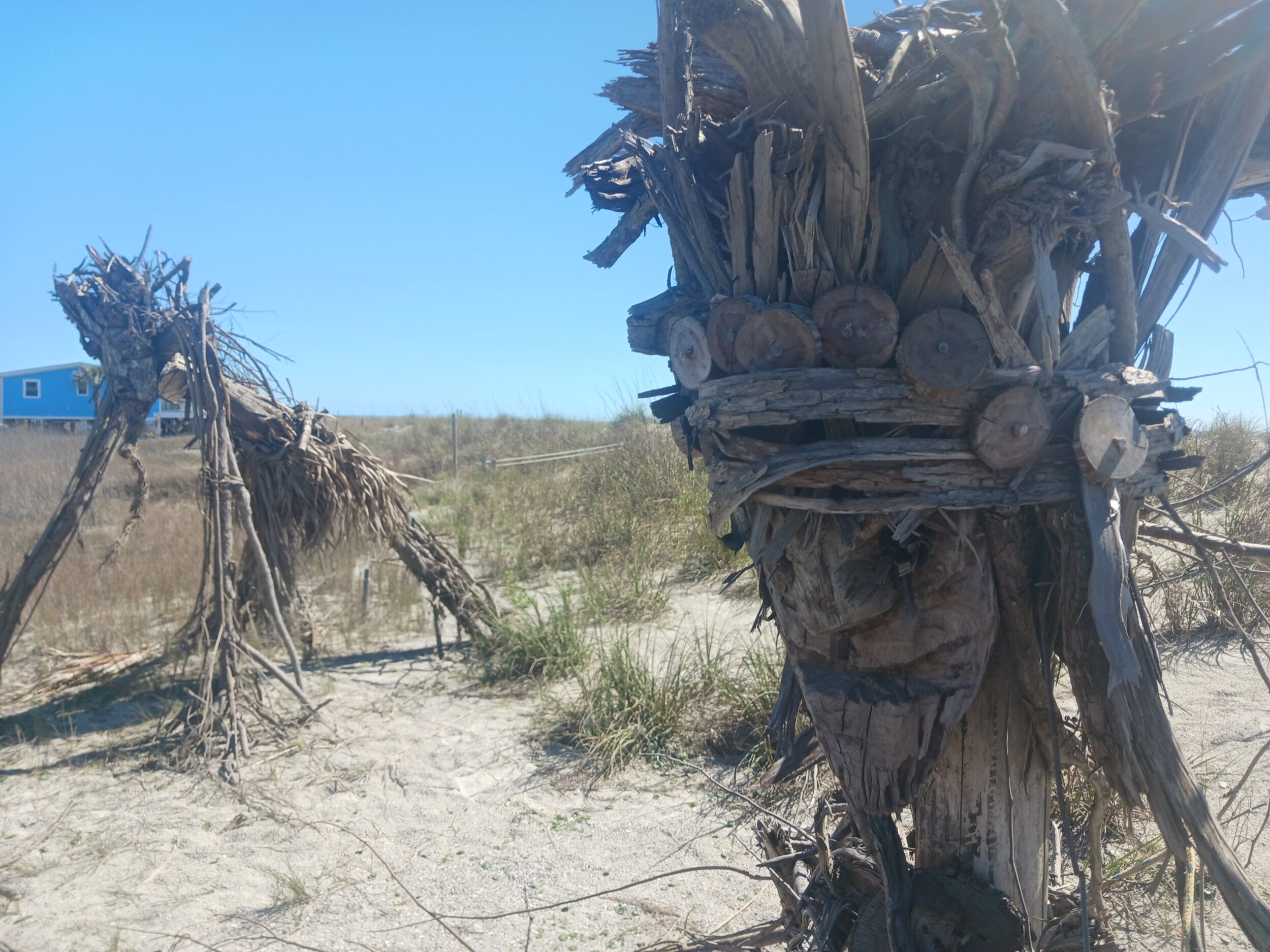 Travel down East Beach Road in Oak Island, and right in the middle of 55th and 58th street you’ll find his masterpiece. He’s created about a half dozen wooden scarecrows out of organic beach materials. They are commonly called The Guardians of Oak Island- which seems like an appropriate name if you have seen the movie Guardians of the Galaxy. In person these figures kind of resemble the character Groot.