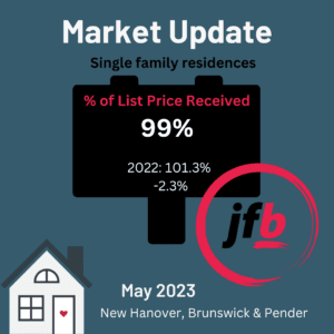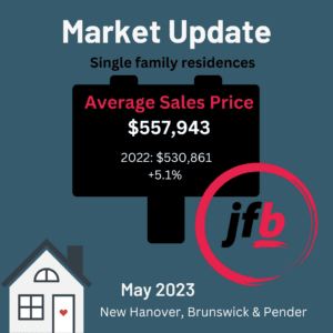 Let’s start with the good news. Checking out the market statistics for single family residences in the tri-county (New Hanover, Brunswick and Pender) area for May 2023, we see that homes are staying on the market a little while longer compared to May 2022. Last year at this time, homes were sitting for 22 days until a sale and this year that number increased to 55 for the month of May.